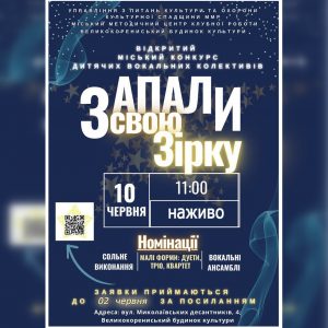 Зоряний небосхил Миколаєва чекає на нові імена! У 2025-му яскравою зіркою можеш стати і ти! Ласкаво просимо до участі у Відкритому міському конкурсі дитячих вокальних колективів «Запали свою зірку». Коли: 10 червня, об 11:00. Де: на базі Великокорениського будинку культури (вул. Миколаївських десантників, 4). Засновниками та організаторами конкурсу є управління з питань культури та охорони...