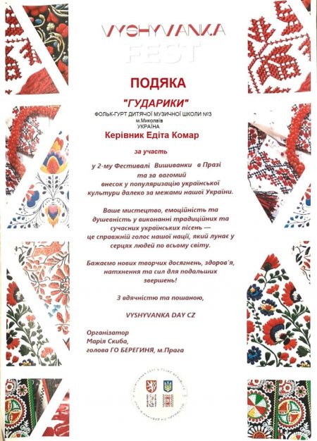 Едіта Комар та її вихованці відзначені подарунками від української діаспори в Празі та Подякою за популяризацію української культури за кордоном.