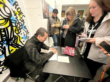 Сашко Обрій (Кучеренко Олександр Васильович) – поет із Миколаївщини, лауреат Премії імені Василя Симоненка, член Національної спілки письменників України, під час зустрічі презентував нову, 5-ту, збірку поезій «ПростеП», яка щойно вийшла друком у «Видавництві Старого Лева» і незабаром з’явиться у вільному продажу. Олександр з жовтня 2024-го року служить в лавах Збройних Сил України, його побратими також завітали на захід, щоб підтримати талановитого воїна.